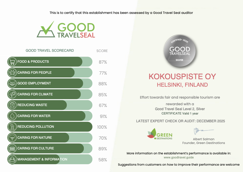 Olemme ylpeitä saadessamme julkistaa, että Green Destinations on myöntänyt Kokouspisteelle Good Travel Seal-sertifikaatin, joka tunnustaa kestävän matkailun ja vastuullisen toiminnan korkeatasoiset käytännöt. Green Destinations on kansainvälinen standardi, joka arvioi matkailukohteiden ja palveluntarjoajien ympäristövastuullisuutta, sosiaalista kestävyyttä ja paikallisten yhteisöjen hyvinvointia tukevia käytäntöjä. Sertifiointi perustuu kansainvälisesti tunnustettuihin kriteereihin, kuten ympäristönsuojeluun, energiatehokkuuteen, jätteiden vähentämiseen, paikallisten palveluiden ja kulttuurin tukemiseen sekä vastuulliseen matkailukäyttäytymiseen.
